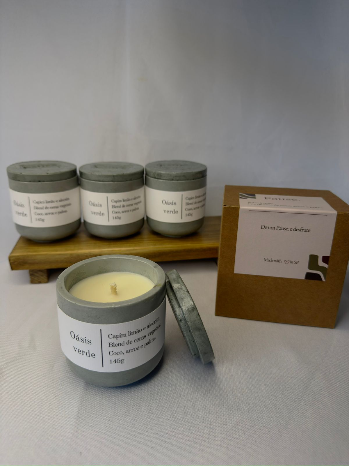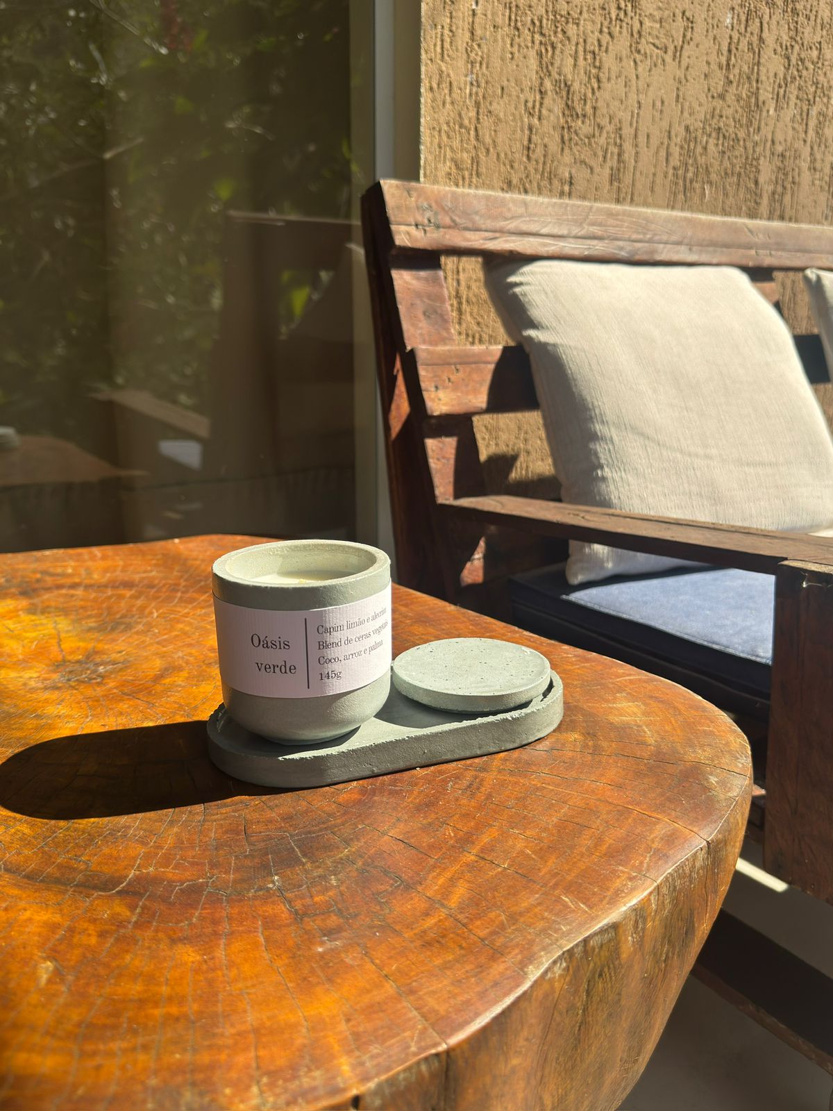 Cada pote de cimento e cada vela são produzidos artesanalmente, garantindo peças únicas.